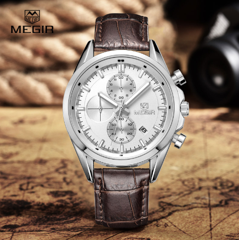 ساعة رجالي 5005Megir بسوار جلدي شكل دائري، ساعة رسمية